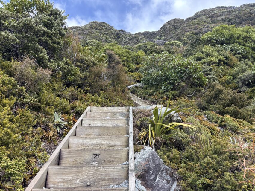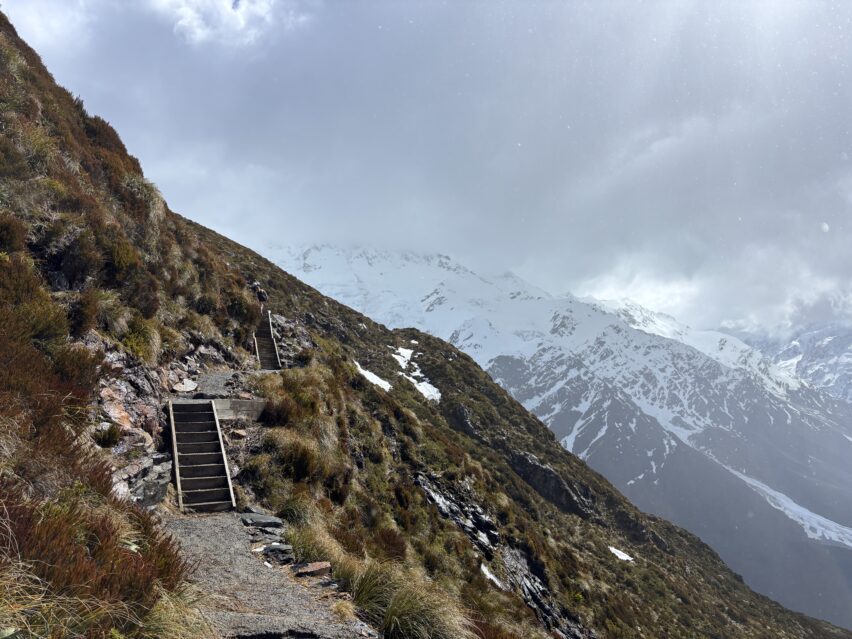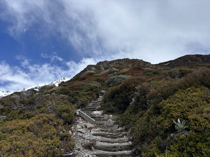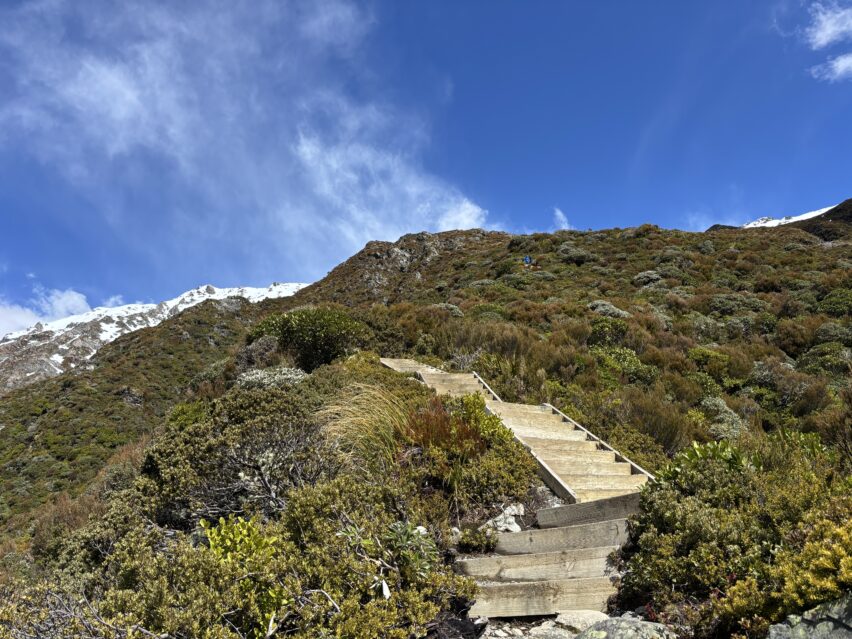 マウントクックとフッカー渓谷を見渡す絶景スポット「ターン(池)」が目的地で、標高差500mを2000段以上の階段の道が続きます。